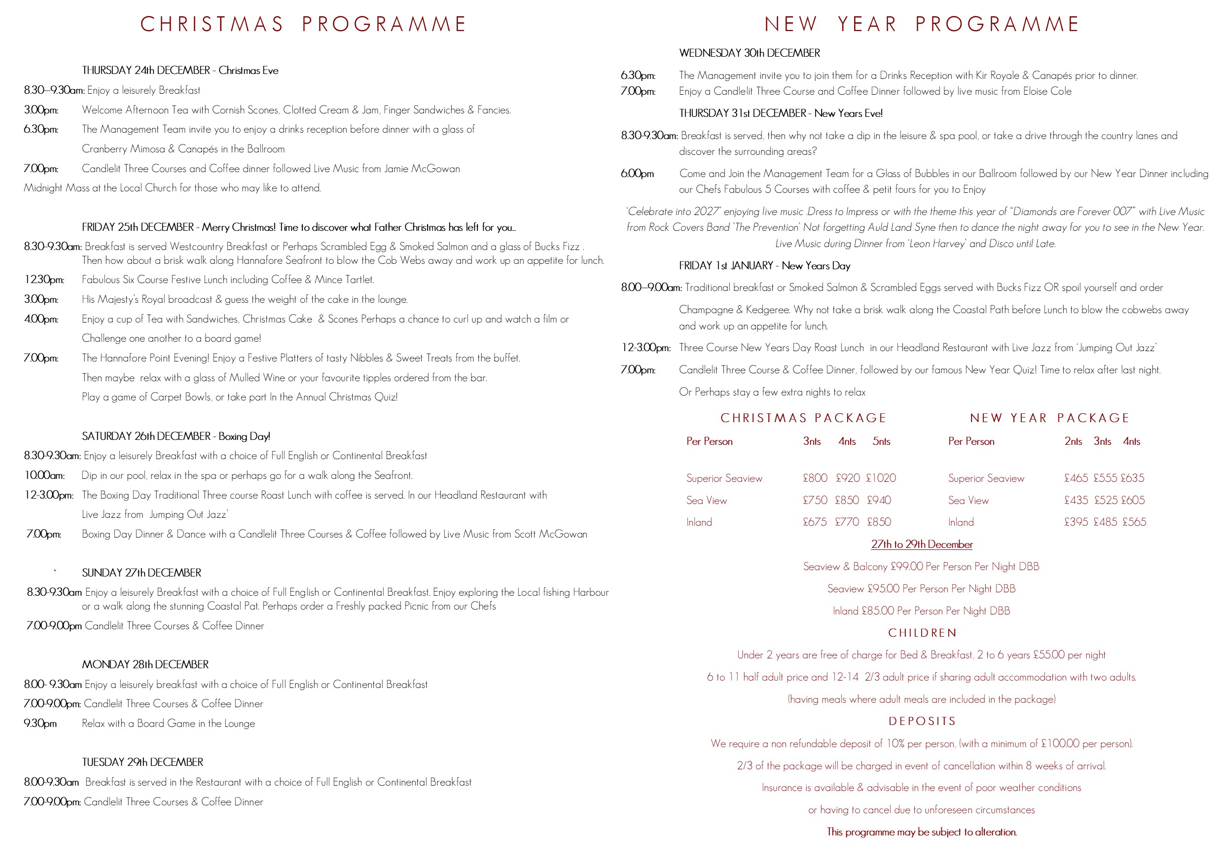12-3.00pm: The Boxing Day Traditional Three course Roast Lunch with coffee is served. In our Headland Restaurant with